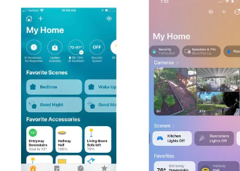 当您打开新应用程序时,您不再面对无休止的“配件”列表(这样一个描述性的词……)和“收藏夹”(我应该如何在我的灯之间选择收藏夹?),然后是一个流的相机快照。相反,由于一些横向魔法,您仍然可以看到您的收藏夹和相机,但现在可以快速滚动到您的所有房间。另外,由于顶部有一个新的快捷方式部分,您可以轻松地按类型对所有设备进行分类:灯光、安全、气候、扬声器和电视以及水。这种组织结构将过去令人沮丧的敲击、滑动和啄食以打开灯或解锁门的体验变成了类似于可用的东西。