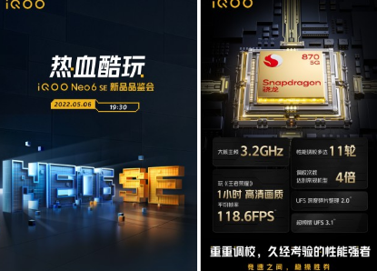 iQOO几周前推出了配备Snapdragon8Gen1SoC的Neo6,今天该公司宣布将于下周(即5月6日)推出Neo6SE。iQOONeo6SE将于当地时间晚上7:30在中国举行的活动中亮相。iQOO尚未详细说明Neo6SE的规格表,但它透露了智能手机的一些规格,包括Snapdragon870芯片、80W充电和256GB存储。