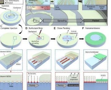纳米膜是使用浮子组装方法创建的,该方法由三步过程组成。第一步是将复合溶液滴在水面上,该溶液是金属纳米线、溶解在甲苯中的橡胶和乙醇的混合物。由于其疏水性,甲苯-橡胶相保持在水面之上,而纳米线最终位于水相和甲苯相之间的界面上。溶液中的乙醇与水混合以降低局部表面 张力,从而产生向外传播的 Marangoni 流并阻止纳米线的聚集。这将纳米材料在水之间的界面组装成单层和非常薄的橡胶/溶剂膜。在第二步中,表面活性剂被滴下以产生第二波 Marangoni 流,从而紧密地压实纳米线。最后,在第三步中,甲苯被蒸发,得到具有独特结构的纳米膜,其中高度压实的单层纳米线部分嵌入超薄橡胶膜中。