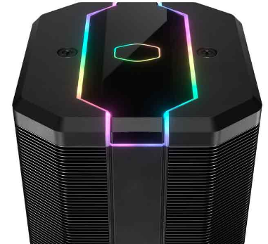CPU散热器的铝散热片缠绕在六个热管上,并带有一个小的散热器。散热器的顶部被外壳覆盖,该外壳装饰有可寻址的RGB照明。一根120毫米CPU风扇产生的气流将管道吹起来。旋转速度在650-2000 rpm的范围内可调。